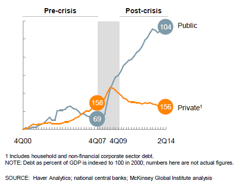 When the GFC hit in late 2007 the drug of choice to dull the the effects of the economic downturn was extensive government spending, often funded via debt issuing's. Since then, for both political and economic reasons, many global economies have been incapable of shaking their debt financed spending addictions. This has lead to an extraordinary growth in debt levels amongst most major economies, with global debt rising by $57 trillion between the end of 2007 and middle of 2014. About a third of this rise in debt was the result of governments borrowing to finance spending. Before we discuss the impact that this meteoric rise in government debt has on investors, it is worth considering why we are less concerned about private debt and more concerned about public (government) debt.